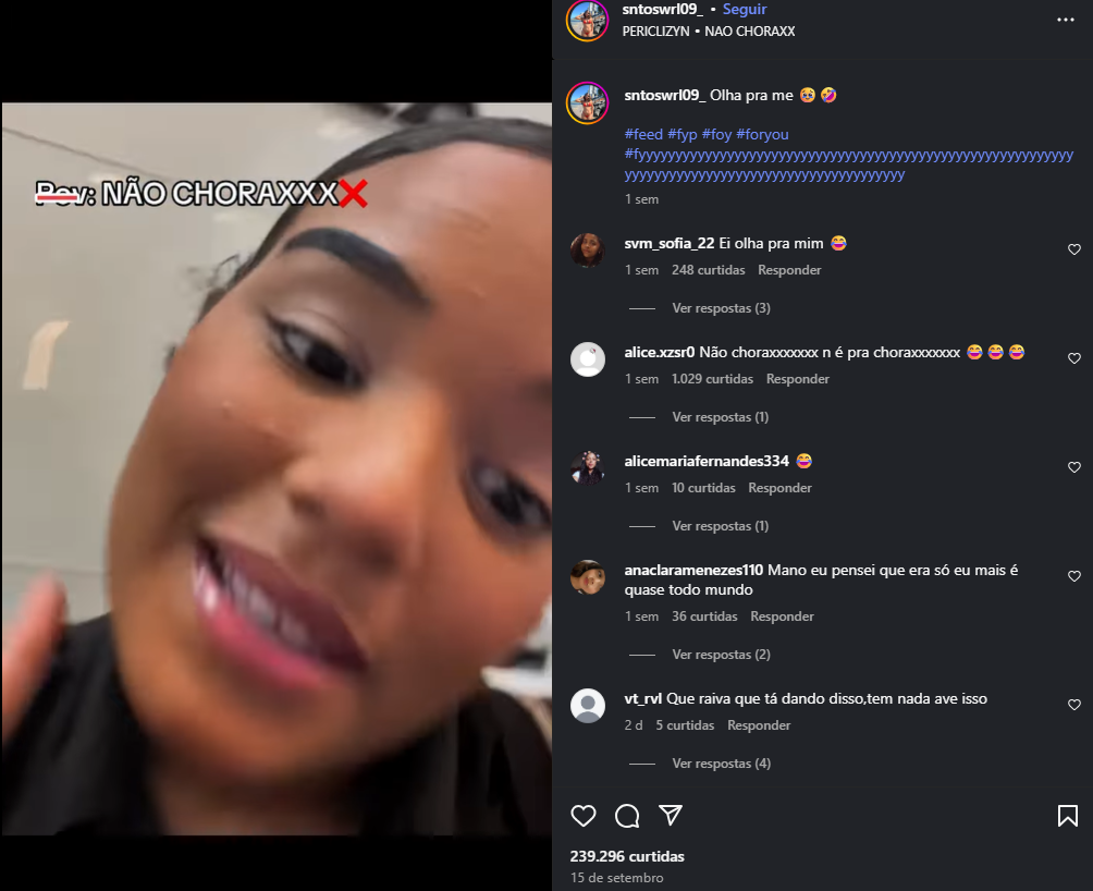 “Moça”, de Kaprixo, mistura uma batida marcante com uma pegada moderna e irreverente. É usada frequentemente em Reels que mostram transições de estilo e coreografias criativas. Porém, também pode ser usada estrategicamente como pano de fundo em vídeos ou fotos comuns, como nesta imagem abaixo.